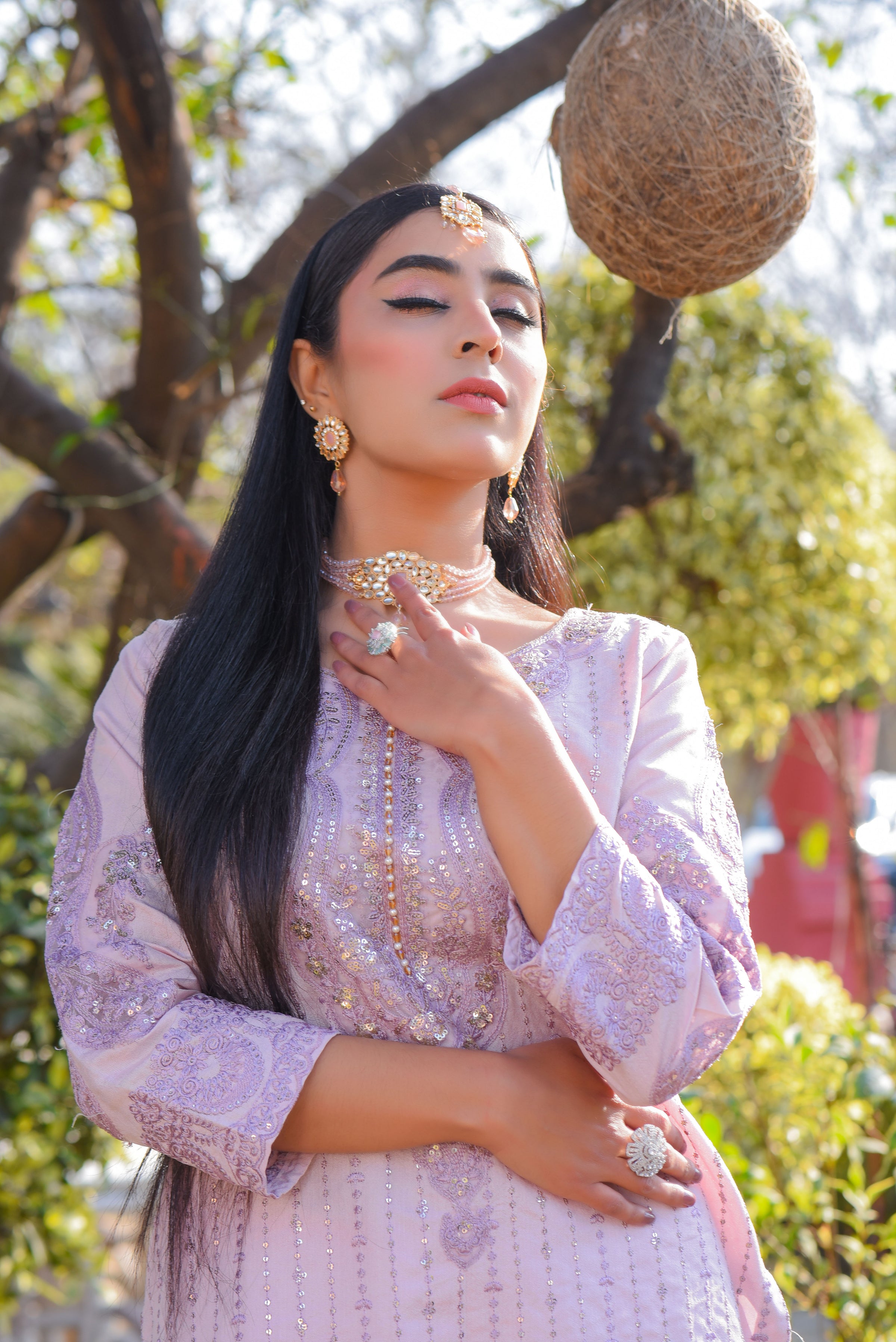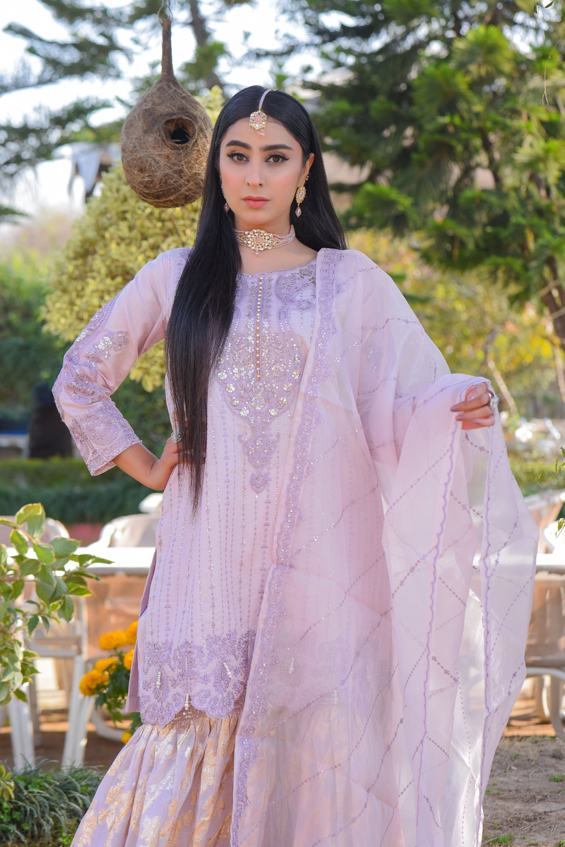 This Stunning Set Has a Lilac Dress Made From Soft Cotton, With a Delicate Silhouette to Flatter The Figure. The Accompanying Sharara is Crafted From Luxurious Jamawar Fabric, Known For Its Intricate Patterns and Texture. The Sheer Organza Dupatta Adds a Touch of Ethereal Beauty to The Outfit. This Ensemble Seamlessly Combines Traditional Charm and Modern Elegance, Suitable for Special Occasions or Cultural Events.