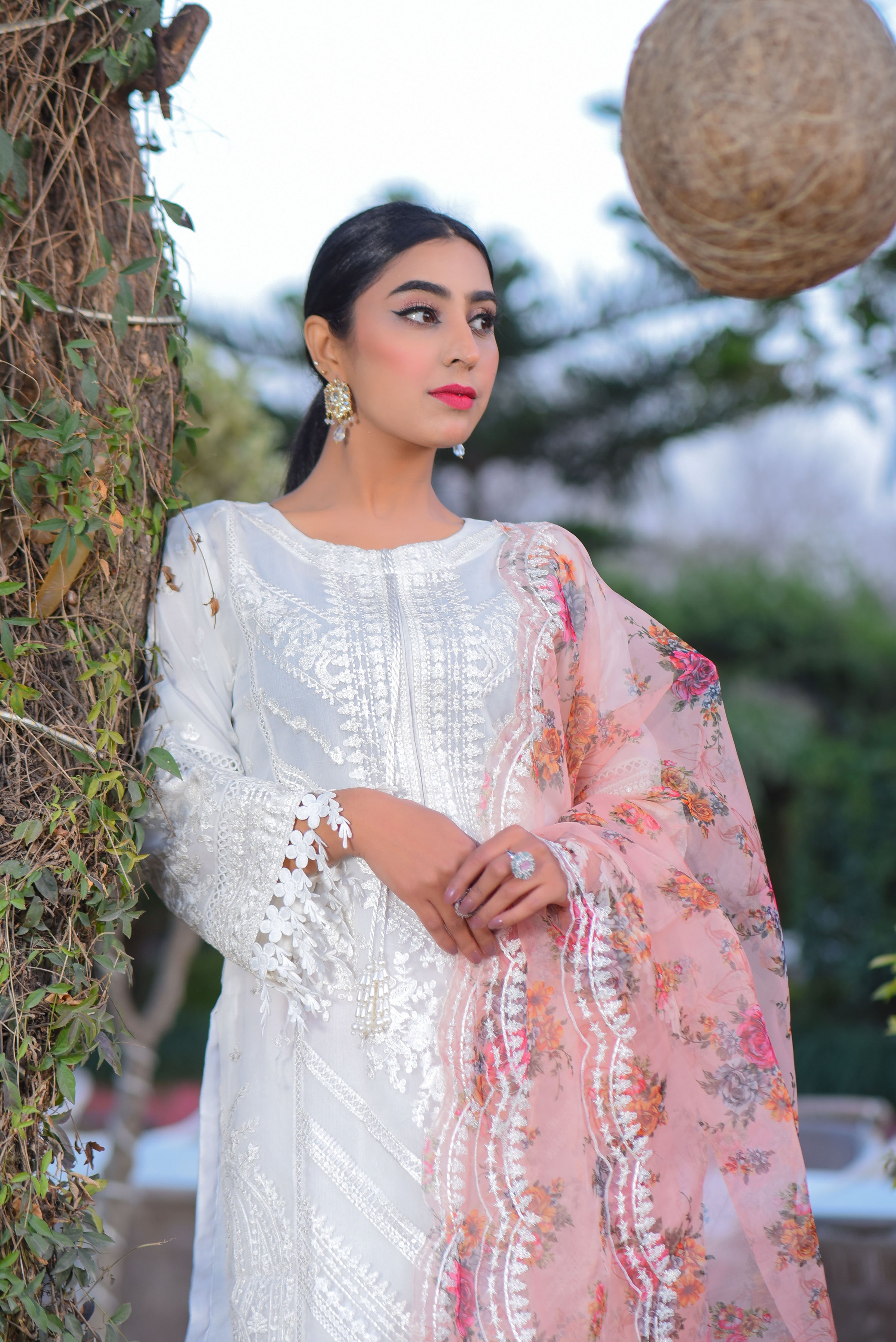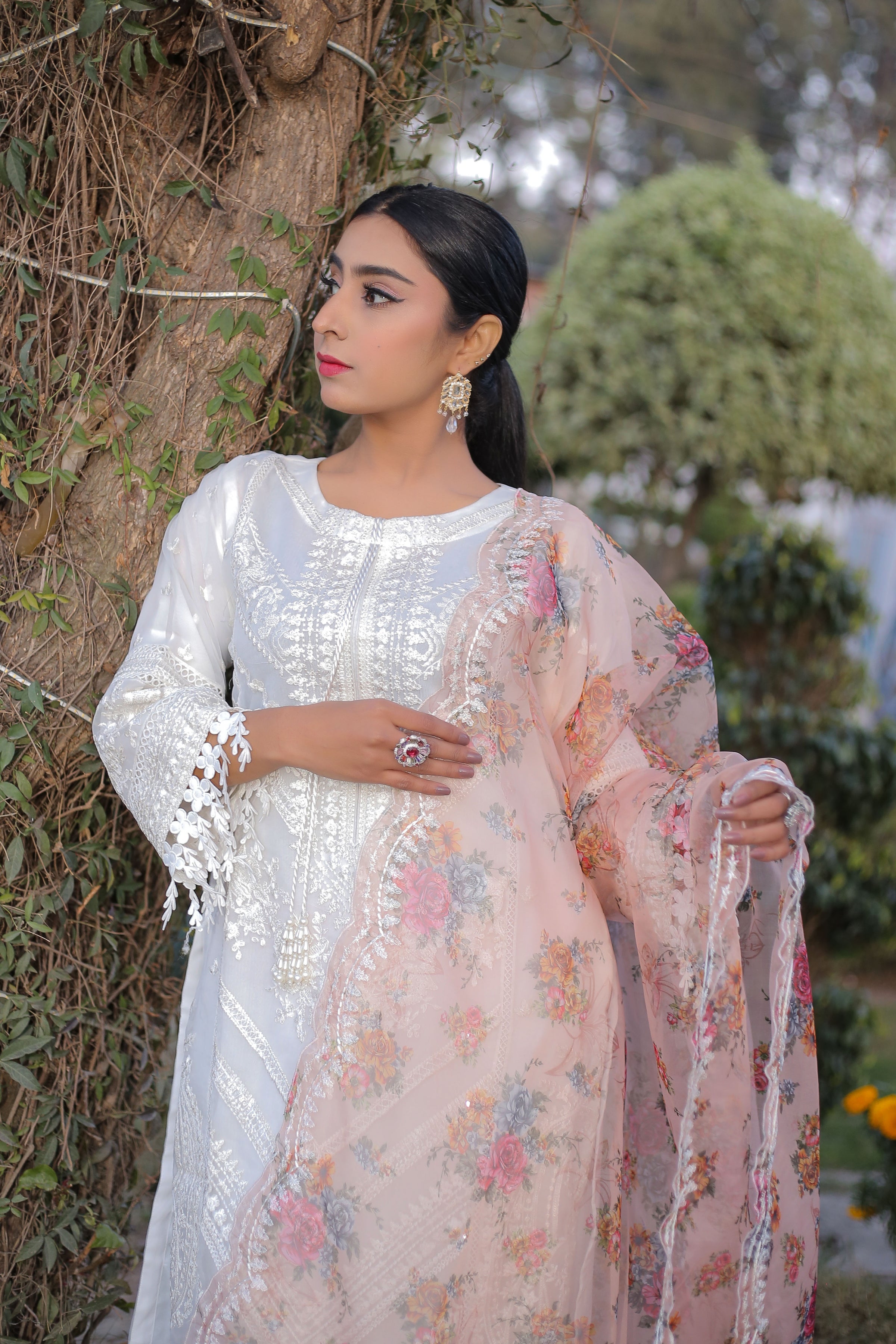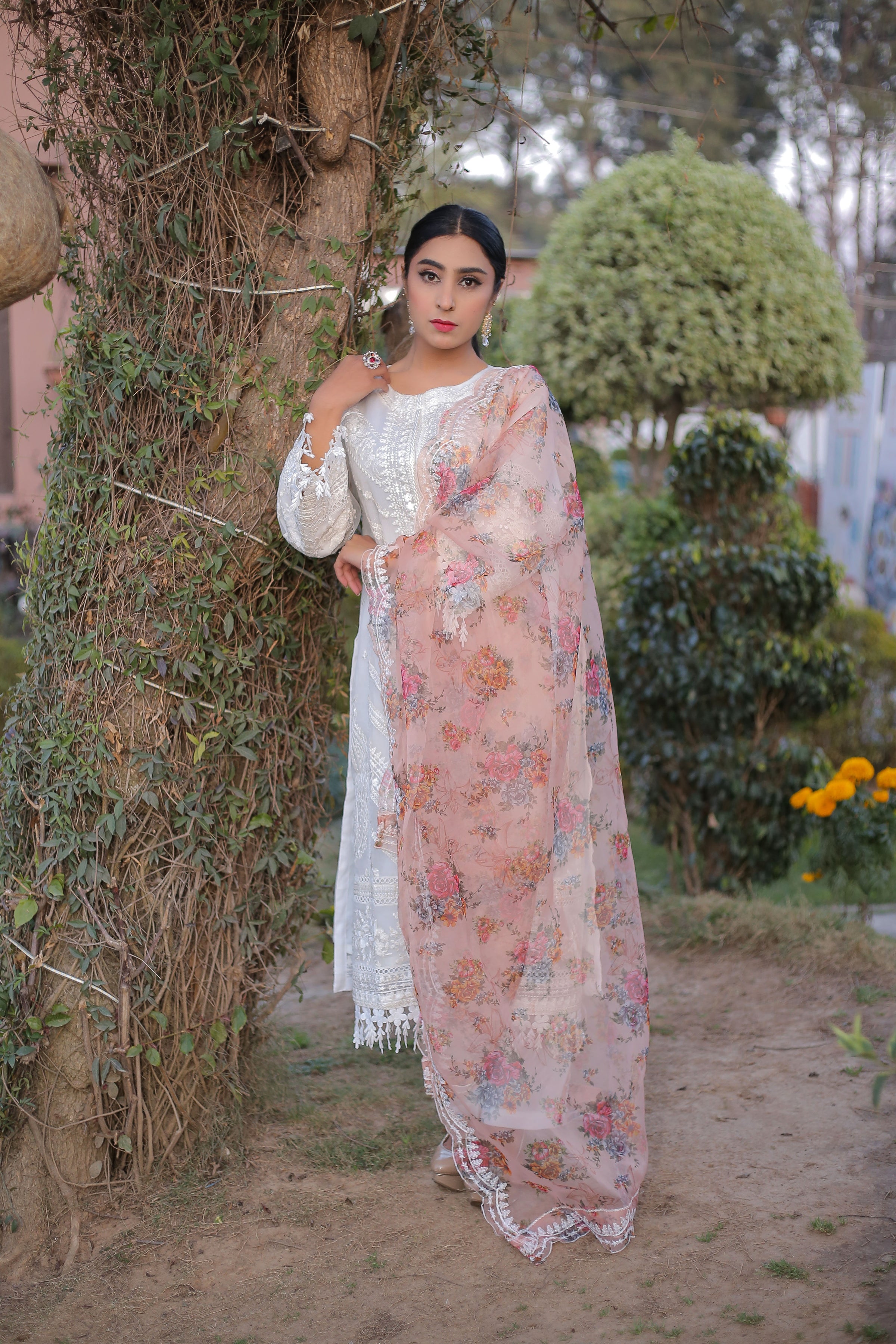 Introducing our ethereal white dress set, complete with matching trousers and a captivating contrast dupatta in a vibrant orange tone. Adorned with delicate embroidery on the front of the shirt, this ensemble effortlessly combines grace with a pop of color. The pristine white hue exudes purity and elegance, while the orange dupatta adds a touch of warmth and allure. Perfect for any festive occasion or formal gathering, this ensemble will make you radiate with timeless charm and sophistication. Embrace the beauty of tradition with a modern twist in this enchanting outfit that is sure to leave a lasting impression.